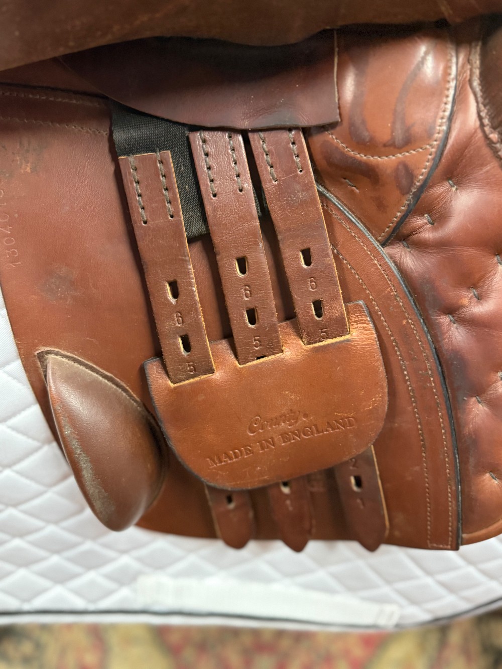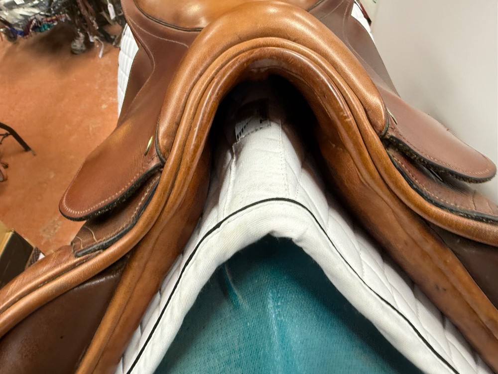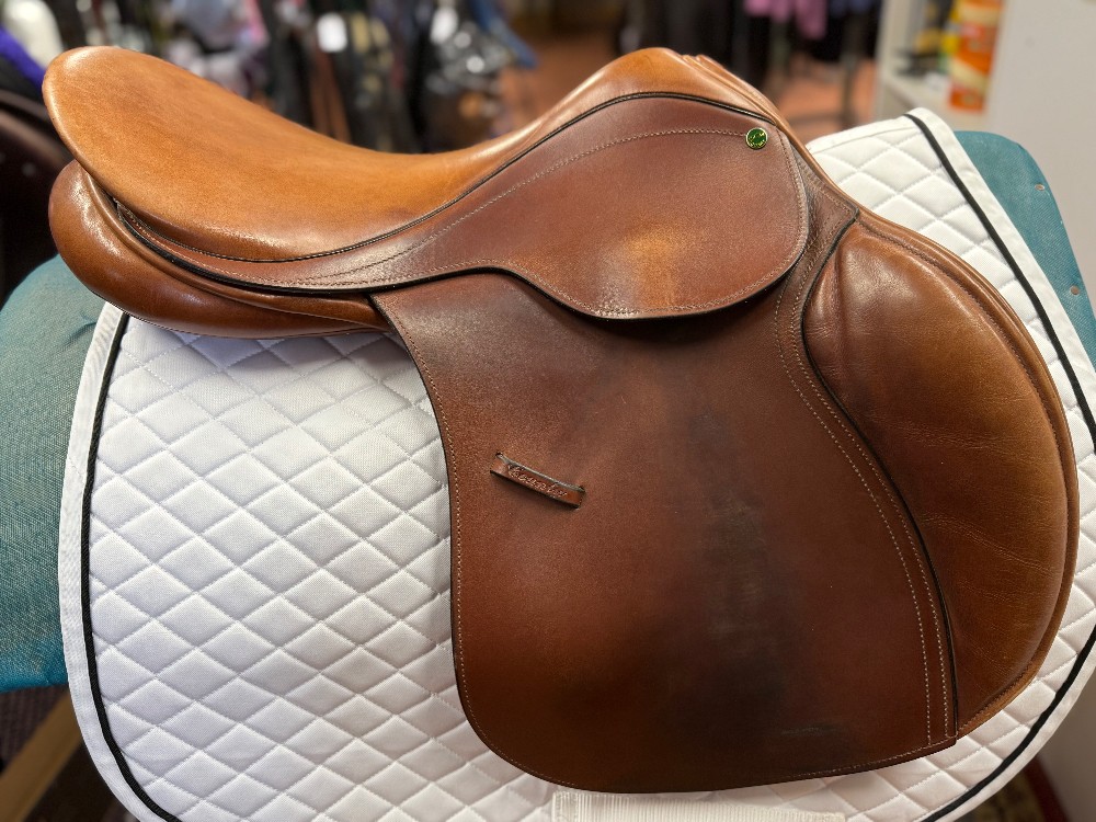 County Conquest Jump Saddle w/spring tree. 18" seat, 14" flap, M gullet. Well cared for used condition. Includes cover. OAKBARK