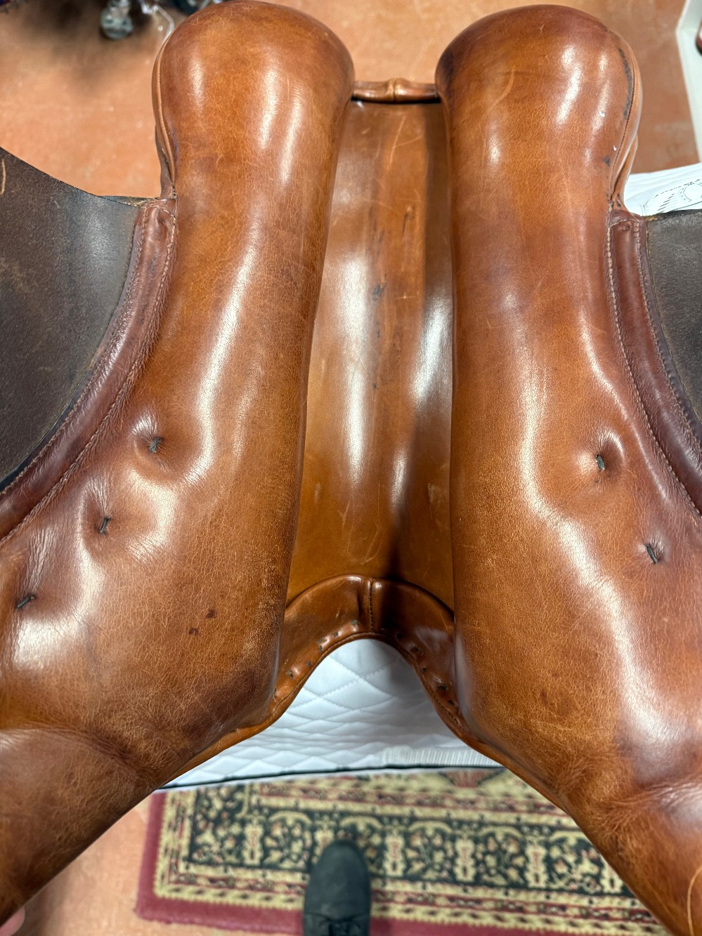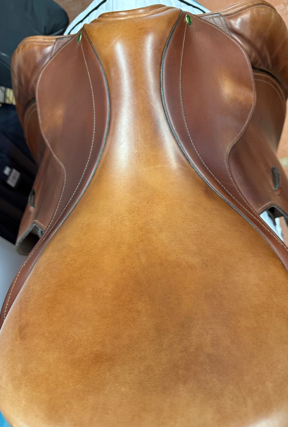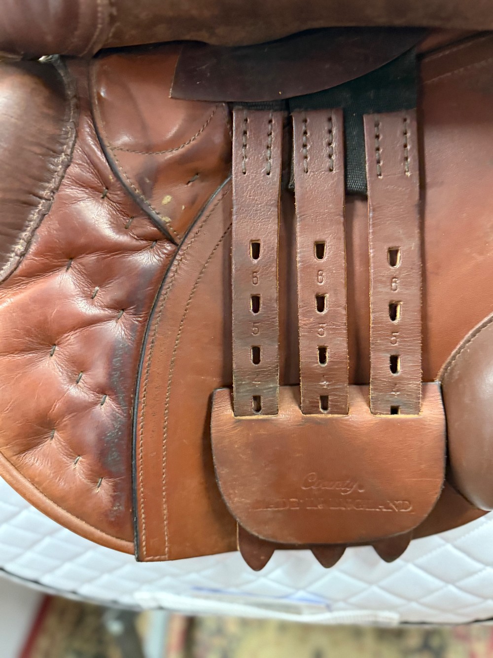 County Conquest Jump Saddle w/spring tree. 18" seat, 14" flap, M gullet. Well cared for used condition. Includes cover. OAKBARK